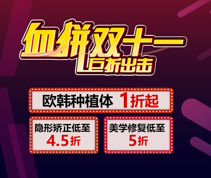 缺牙朋友们赶紧看过来,这个双十一买啥不如买健康,激动人心的时刻来了,血拼双十一、高端种植体最低1折起,简直省到家,预约成功再免挂号费、拍片费、专家费。重新用上人类的第三幅牙齿就现在,1折优惠,3项免费、恢复缺牙+省钱、一步到位。【抢约通道 >】