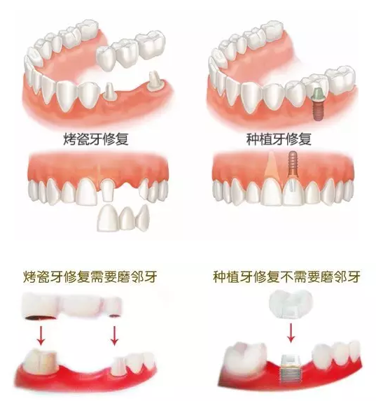 烤瓷牙的性价比更高吗?也不见得,因为烤瓷牙的修复方式需要以相邻的两颗健康好牙作为代价来实现“搭桥”。换言之,缺一颗牙,需要承担三颗烤瓷牙的费用。而这笔费用已经与单颗种植牙的花费相差不大。