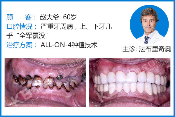 康贝佳特聘的意大利知名种牙医生法布博士为赵大爷主诊。法布博士说,由于重度的牙周炎,全口的牙已经都失去了功能,并为赵大爷设计了“即刻种植”方案。由于赵大爷缺牙较多,而且部分牙齿牙槽骨已经萎缩,医生立即为他选择了ALL-on-4种植,上下总共用了8颗植体,然后装上临时牙套,一口新牙诞生了,当天下午周先生开开心心回家了。