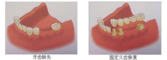 固定义齿包括桩冠和固定桥。利用口中的残根、残冠可进行根管治疗后保留,治疗后的牙根上可进行固定修复恢复牙齿外形,称为桩冠修复。